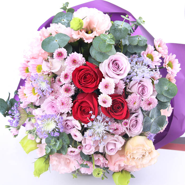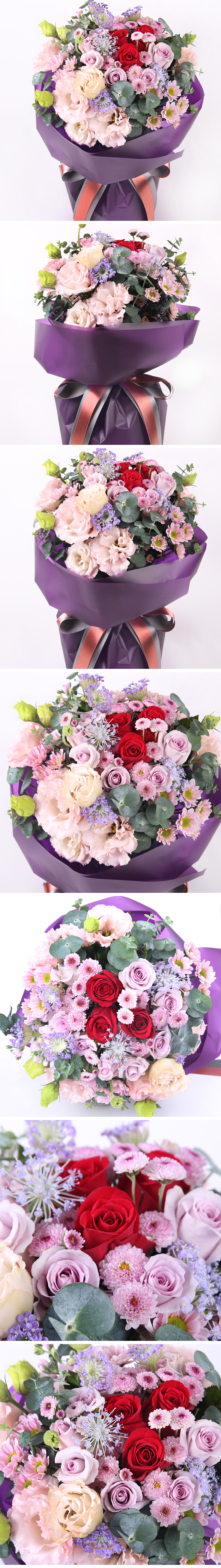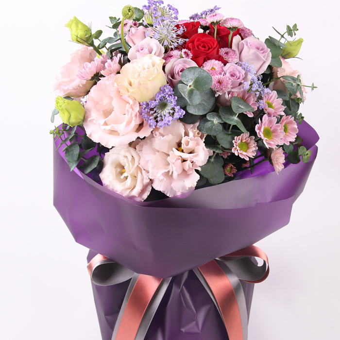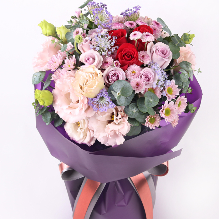 빨강장미,보라장미,리시안셔스(연핑크),소국,디디스커스,유칼립투스 고급포장지와 세련된 디자인 전문 플로리스트 상품제작