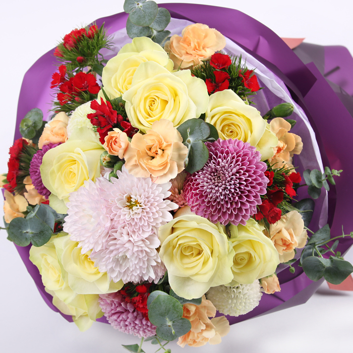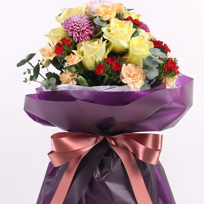 노랑장미,소국(연핑크,자주),패랭이(빨강),스프레이카네이션(살구색),유칼립투스 고급포장지와 세련된 디자인 전문 플로리스트 상품제작