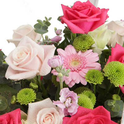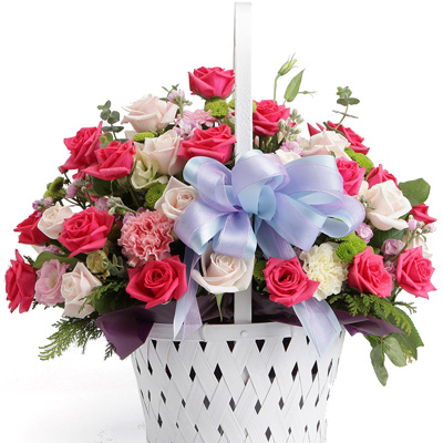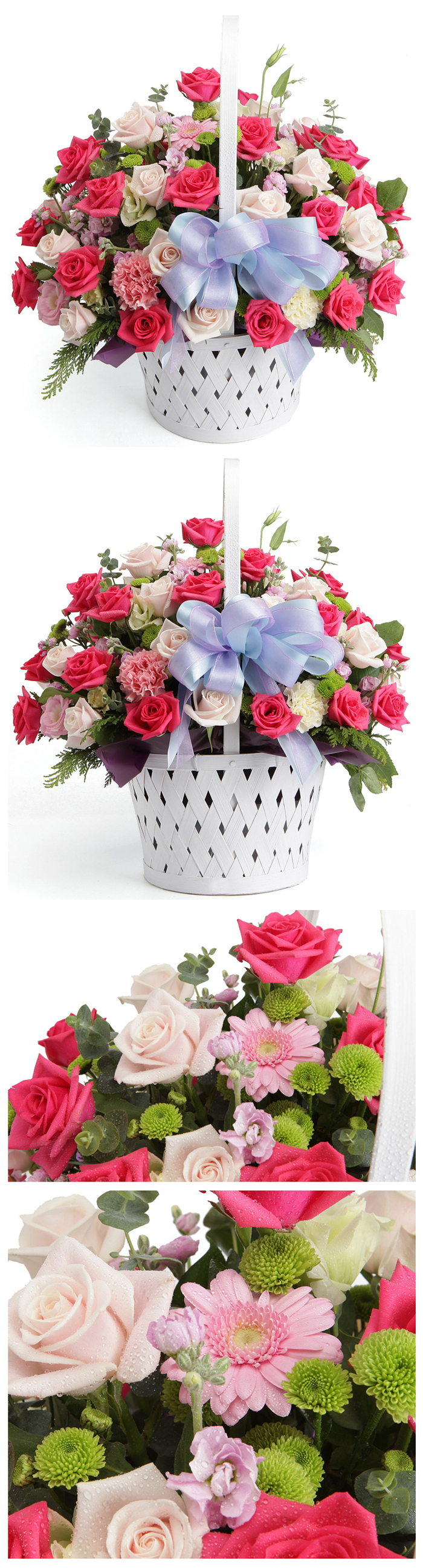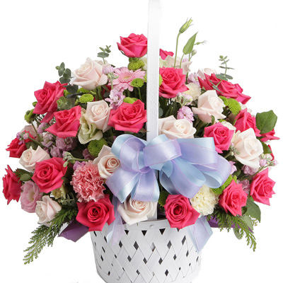연핑크장미(부르트), 블루스타, 부바르디아, 그린소재, 고급바구니와 세련된 디자인 전문 플로리스트 상품제작